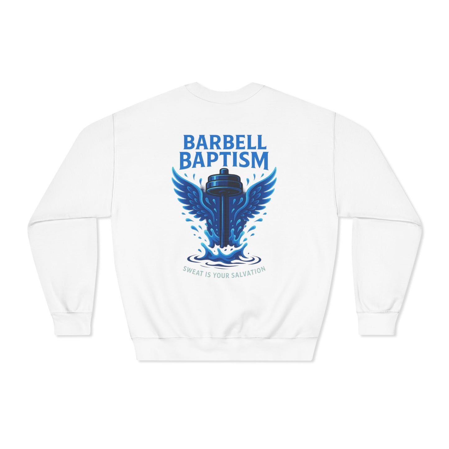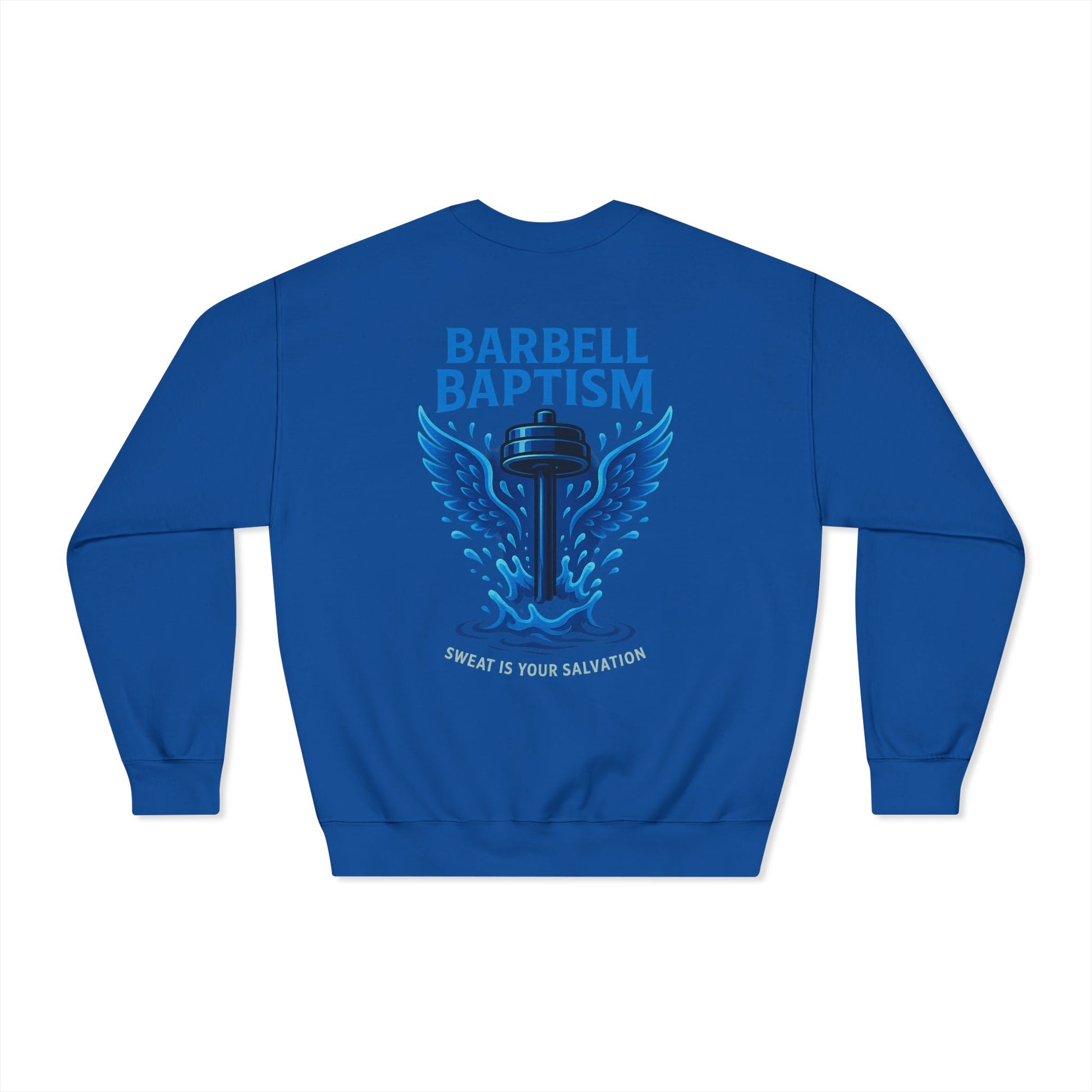 Barbell Baptism DryBlend Crewneck Sweatshirt (front logo + back design) – Gym Apparel