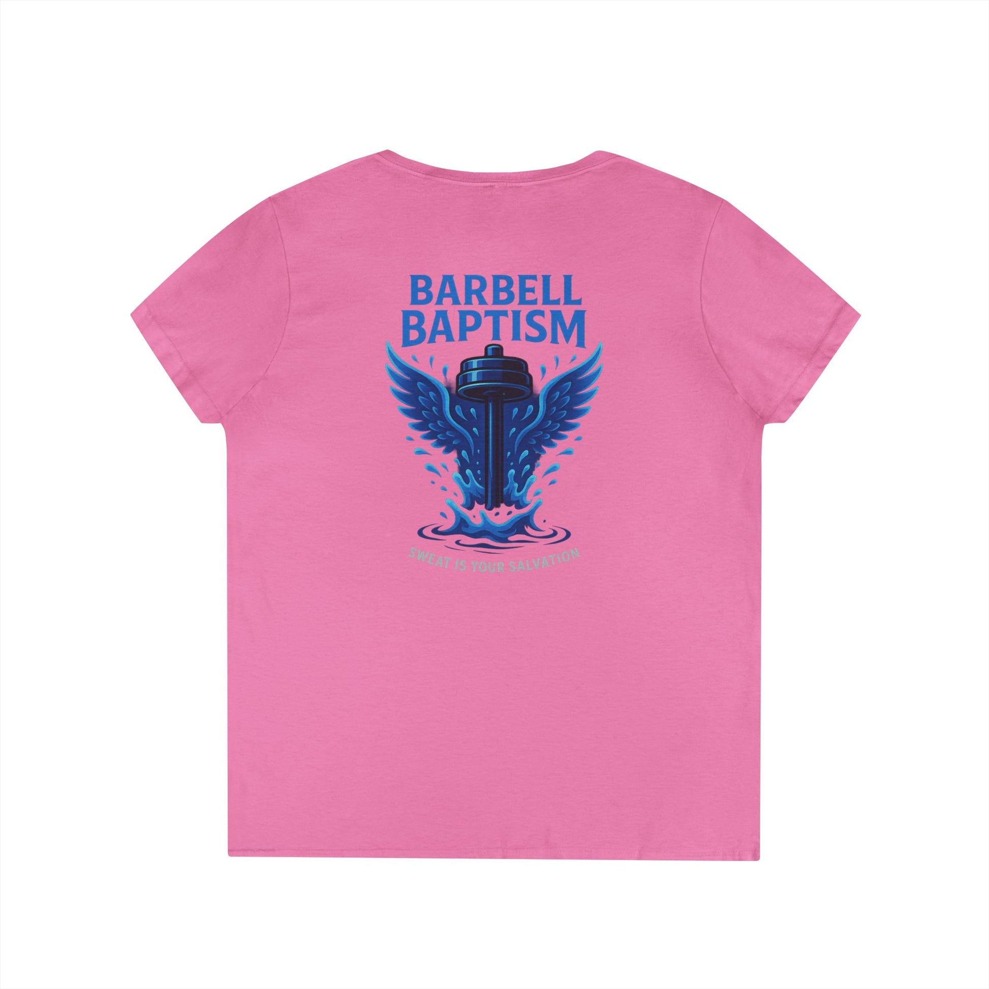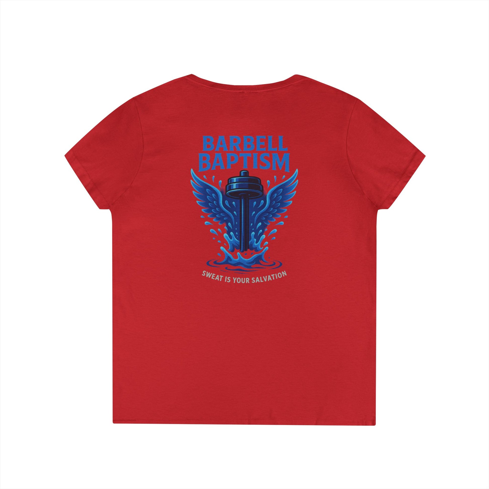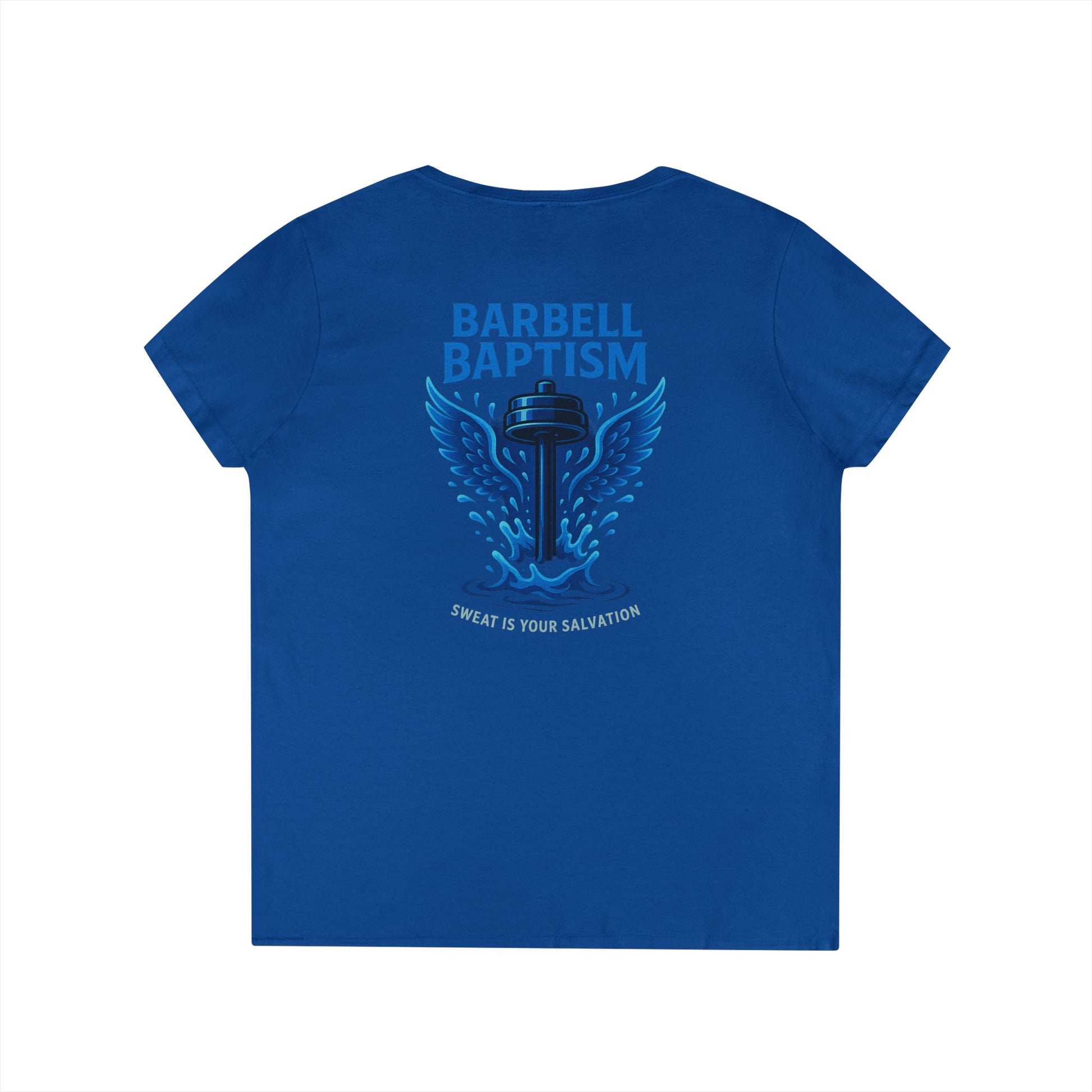 Barbell Baptism V-Neck T-Shirt (front logo + back design) – Gym Apparel