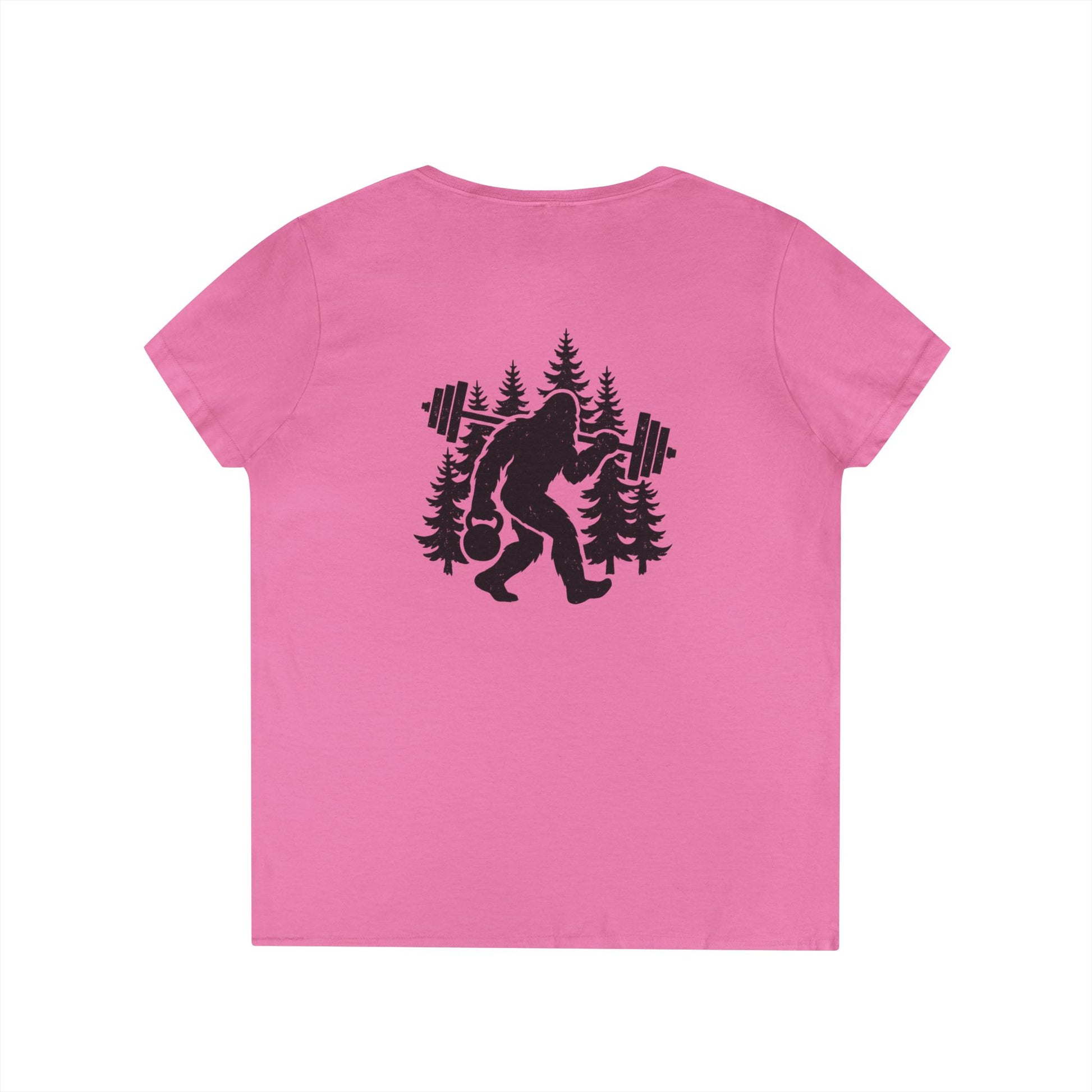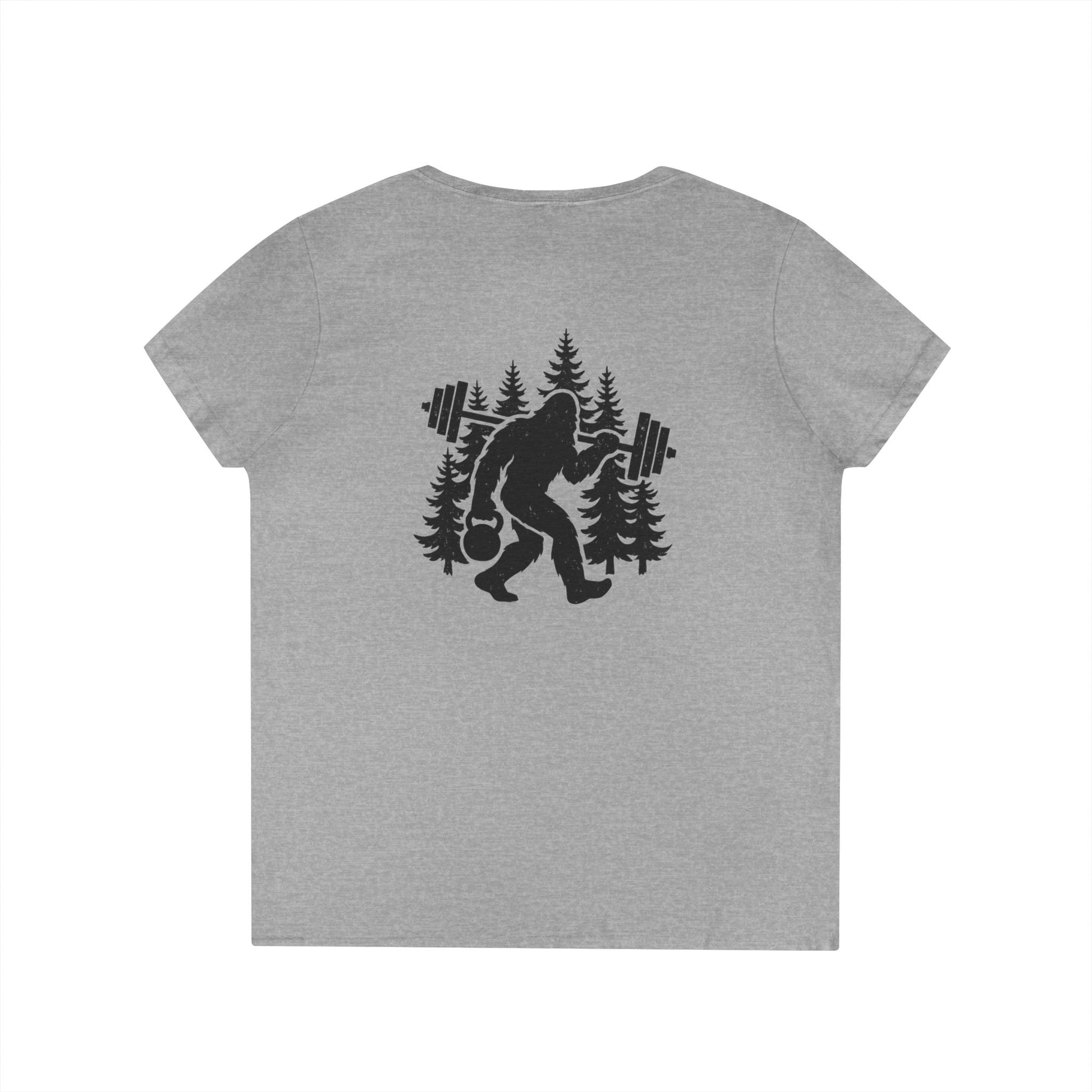 The Bigfoot Gains Ladies V-Neck pairs a clean front logo with a bold back graphic of Bigfoot tossing around serious weight. It's made for those who stay out of sight but never out of discipline. Loud isn’t the goal — strong is.