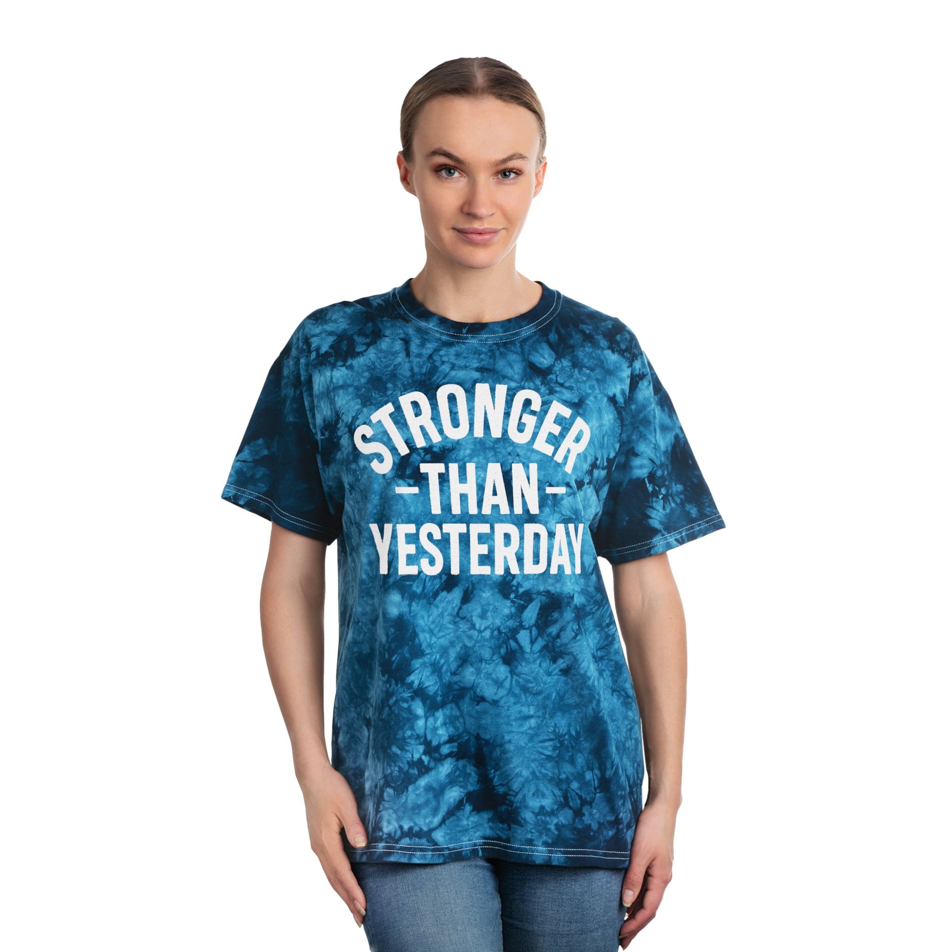 Design: Bold “Stronger Than Yesterday” front graphic in red or blue tie-dye options